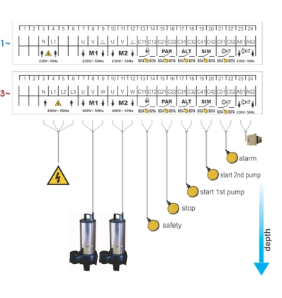 Avec les interrupteurs en position (AUT), chaque fois que le niveau atteint la commande de démarrage de la 1ère pompe (C31-C32), une des pompes s’allumera en alternance et ne s’éteindra que lorsque le niveau descendra jusqu’au niveau d’arrêt (C21-C32). C22). Si le niveau monte jusqu’au niveau de simultanéité (commande de démarrage de la 2ème pompe C41-C42), les 2 pompes commenceront à fonctionner simultanément, ne s’éteignant que lorsque le niveau descendra au niveau d’arrêt (C21-C22).