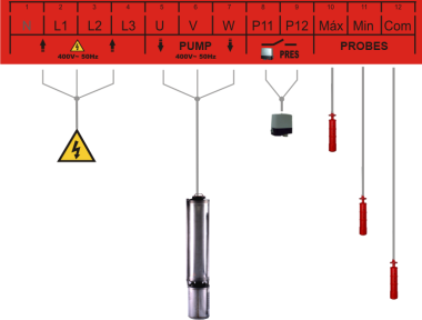 Si le contrôle start/stop (P11-P12) se ferme, le relais de niveau s’allume (LED jaune sur le relais de niveau), et lit le niveau d’eau à travers les sondes (dans le puits, le trou, le réservoir, etc.). Si l’eau est au-dessus de la sonde de niveau maximum, le relais de niveau indique allumé (LED verte sur le relais de niveau) et la pompe démarre (indicateur vert), s’éteignant si le contrôle marche/arrêt s’ouvre ou si l’eau descend en dessous du minimum. sonde de niveau (LED rouge sur le relais de niveau).